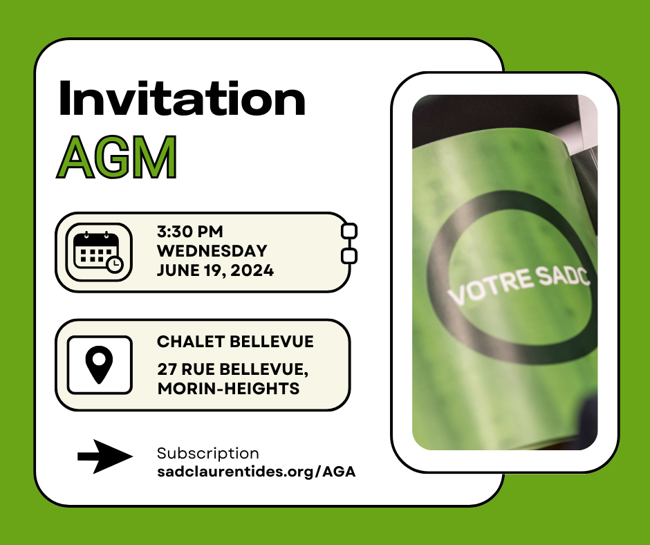 The board members of the SADC des Laurentides invite you to participate in the 29th general assembly of the organization, which will take place on June 19 at 3:30 PM at the Chalet Bellevue in Morin-Heights. This will be an opportunity to present the achievements of the past year and the action plan for the current year. The assembly will be followed by a cocktail reception.